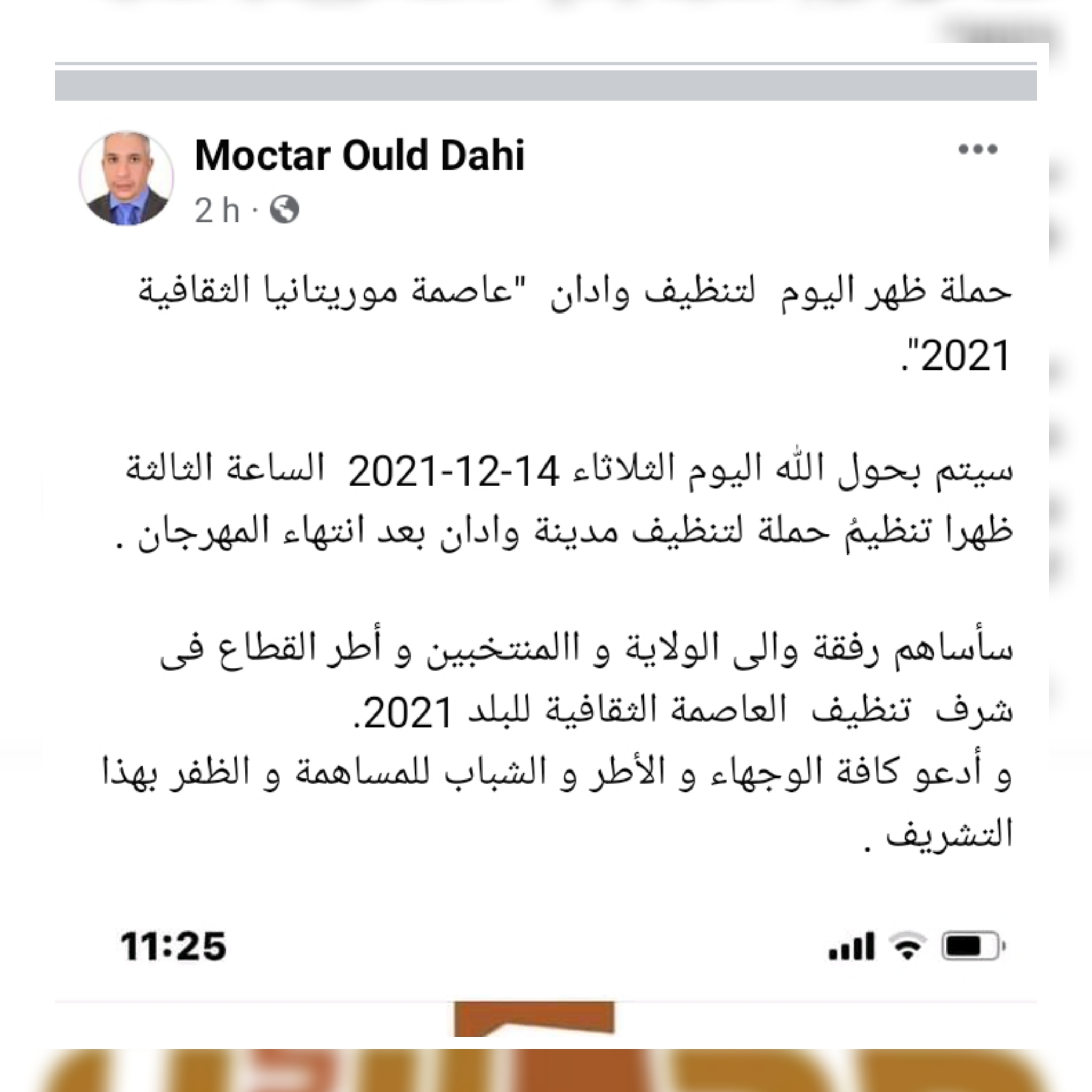 رفقة والي ولاية آدرار معالي وزير الثقافة الناطق الرسمي باسم الحكومة السيد المختار ولد داهي يترأس حملة نظافة شاملة لمدينة وادان التاريخية ظهر اليوم بعد انتهاء فعاليات النسخة العاشرة من مهرجان مدائن التراث الذي احتضنته مدينة وادان في الفترة ما بين ال 10 و14 من الشهر الجاري .