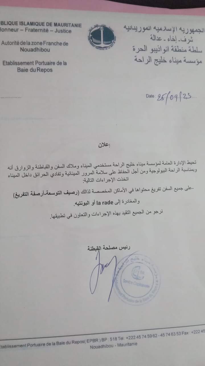 إدارة "ميناء خليج الراحة "تدعو السفن الى تفريغ حمولتها فى الأماكن المخصصة لذلك (وثيقة)