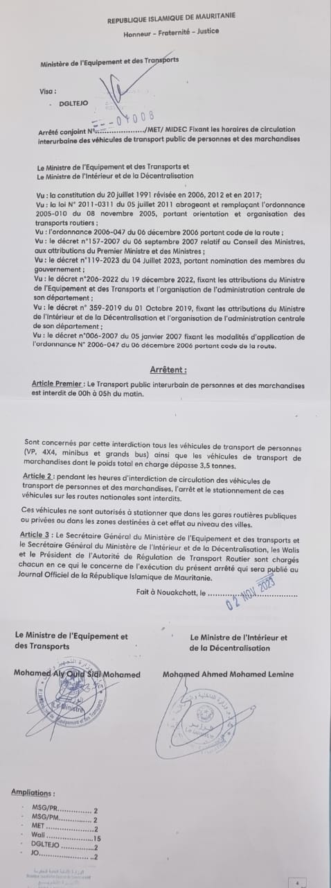 وجاء في مقرر الوزارة ,,: يحظر النقل من الساعة 00 ليلا إلى غاية الساعة 05 فجرا.