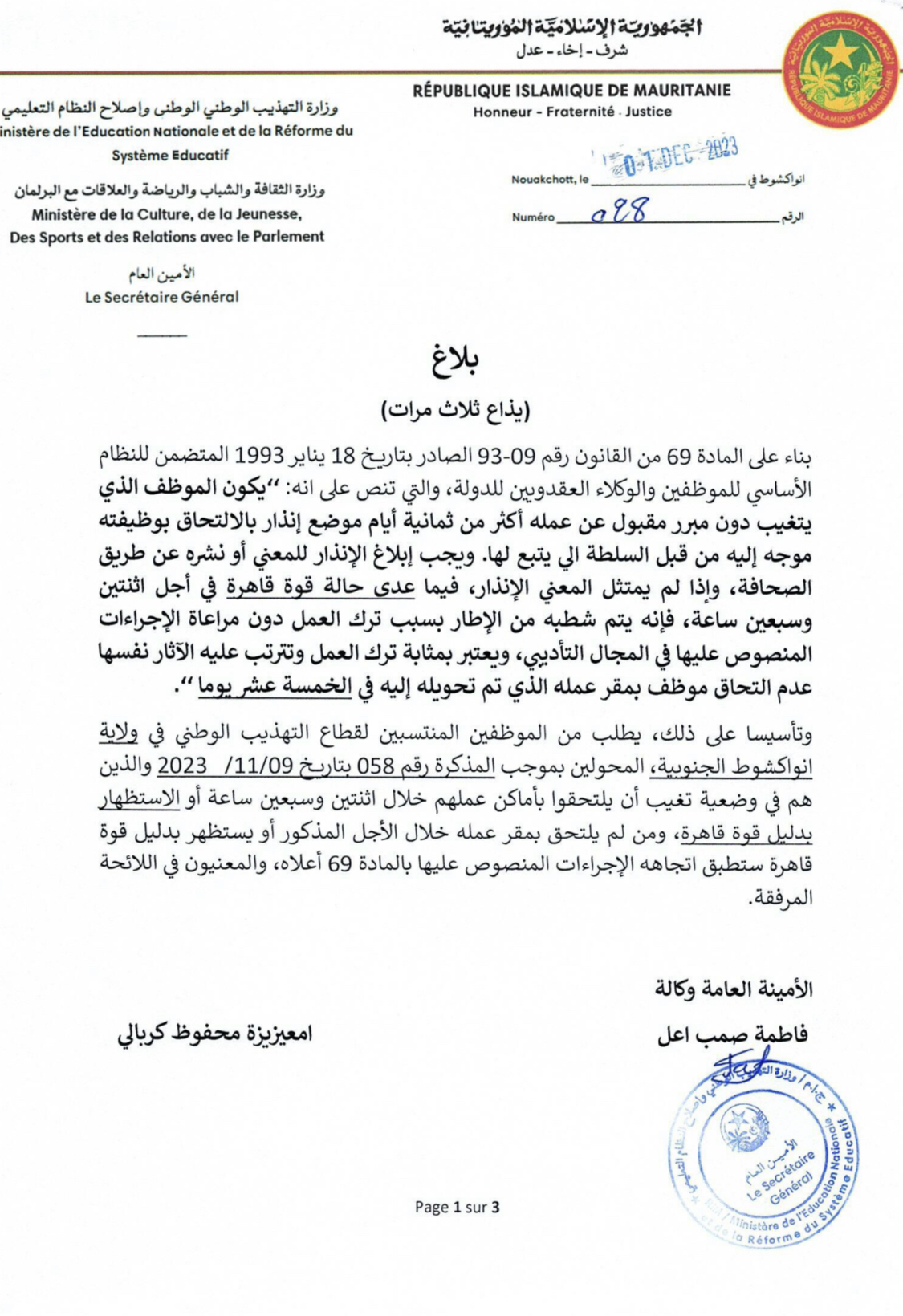 وزارة التهذيب تنذر المنتسبين للقطاع فى ولاية نواكشوط الجنوبية والمحولين بموجب مذكرة؛ الإلتحاق بأماكن عملهم خلال 72 ساعة