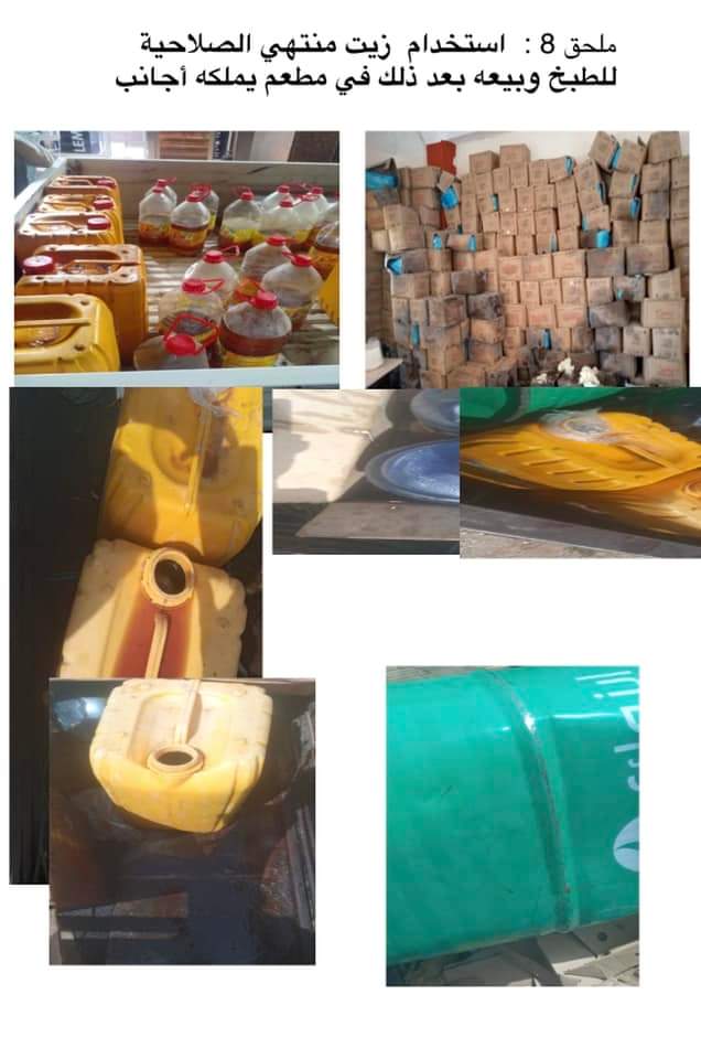 • إغلاق مطعم مملوك لأجانب كان يستخدم زيت منتهي الصلاحية ويبيعه لمطاعم اخرى، وقد تم حجز كمية الزيت الفاسدة وإحالة مسؤول المطعم للعدالة (ملحق8).