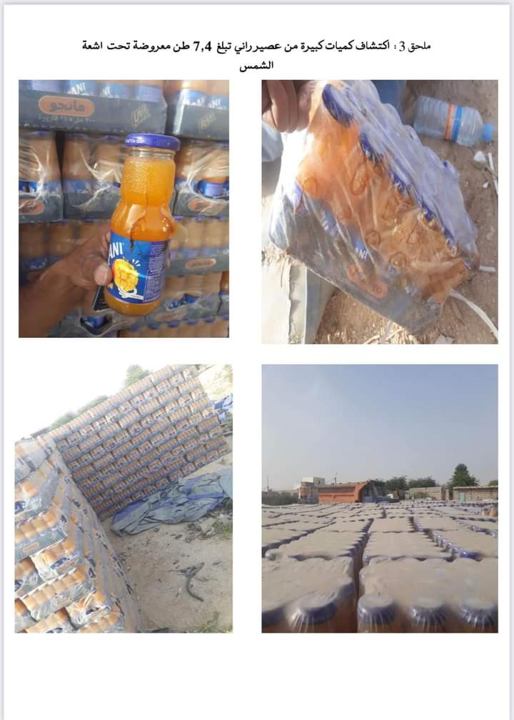 • العثور في مقاطعة الميناء على كمية من عصير راني مخزنة في ظروف غير مناسبة بوضعها في العراء وتحت اشعة الشمس ذات الضرر البالغ بالصحة وقد تمت احالة حائزها للعدالة (ملحق3).