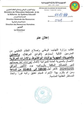 طالبت وزارة التهذيب الوطني وإصلاح النظام التعليمي نحو 300 موظف تابع للقطاع، بالحضور لدى إدارة الرواتب لتسجيل بصمتهم يوم الاثنين المقبل. وهددت الوزراة من لم يلتزم بذلك بتعليق راتبه واتخاذ المسطرة القانونية بحقه.