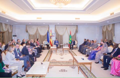 وجرى هذا اللقاء بحضور معالي الوزير المكلف بديوان رئيس الجمهورية المختار أجاي، ومعالي وزراء الشؤون الخارجية والتعاون، والداخلية واللامركزية، والشؤون الاقتصادية والتعاون، والبترول والطاقة والمعادن، والبيئة والتنمية المستدامة، و مكلف بمهمة برئاسة الجمهورية، و مستشارين برئاسة الجمهورية، السيدة وزينب بنت أعلي سالم، سفيرة بلادنا المعتمدة لدى المملكة الإسبانية.