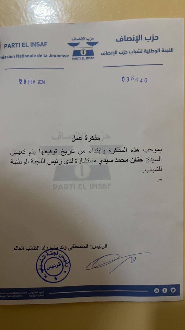 أصدر رئيس اللجنة الوطنية لشباب حزب الإنصاف مذكرة اليوم بموجبها عين الإعلامية حنان محمد سيدي مستشارة له. وتعد الإعلامية حنان وجها إعلاميا بارزا، وهي مقدمة برامج وكاتبة لها عديد المقالات.