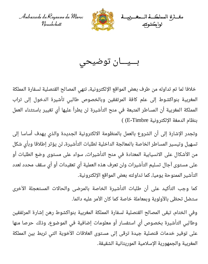 خلافا لما تم تداوله من طرف بعض المواقع الإلكترونية، تنهي المصالح القنصلية لسفارة المملكة المغربية بنواكشوط إلى علم كافة المرتفقين وبالخصوص طالبي تأشيرة الدخول إلى تراب المملكة المغربية أن المساطر المتبعة في منح التأشيرة لن يطرأ عليها أي تغيير باستثناء العمل بنظام الدمغة الإلكترونية E-Timbre) )
