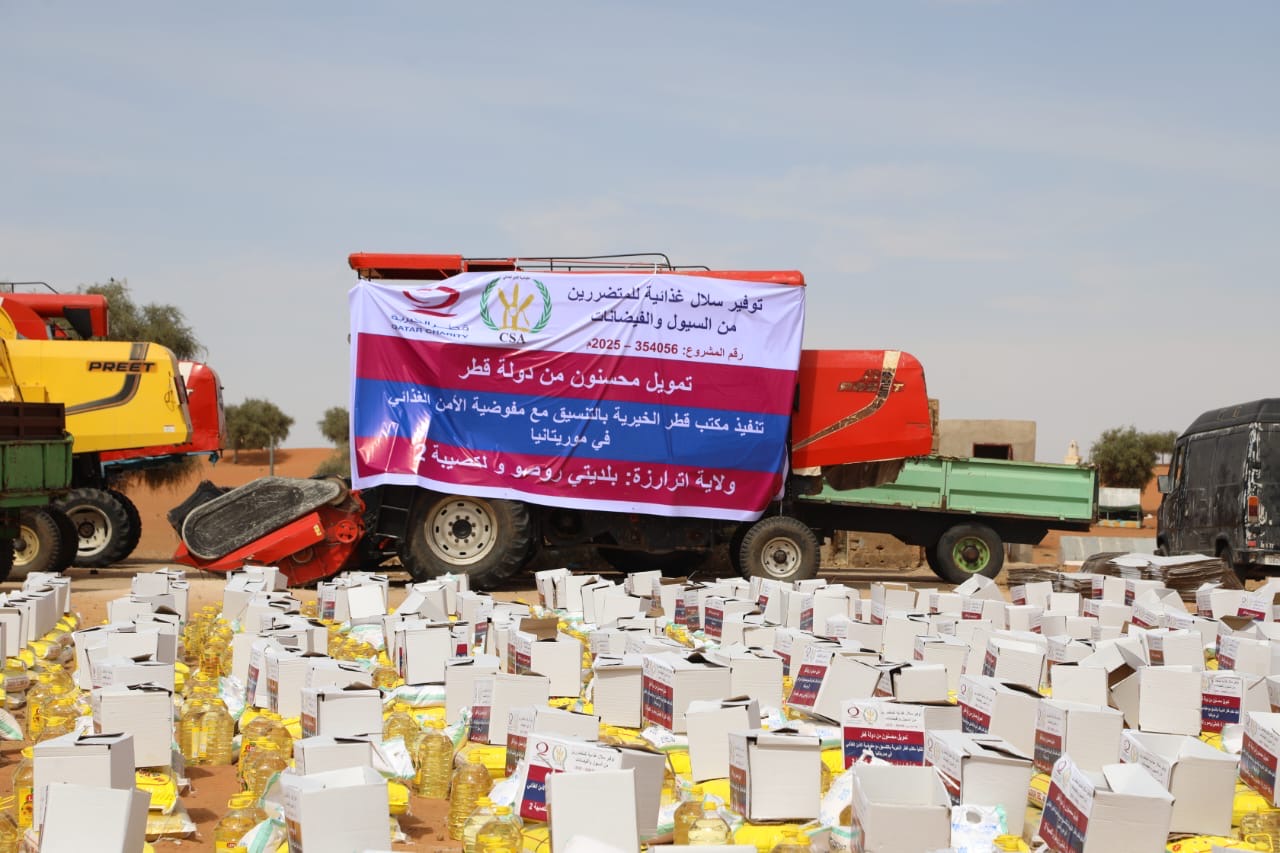 بدأ اليوم مكتب قطر الخيرية بالتعاون مع مفوضية الأمن الغذائي في موريتانيا ، توزيع مساعدات غذائية لصالح مئات الأسر المتضررة من فيضان النهر، بولاية اترارزة.