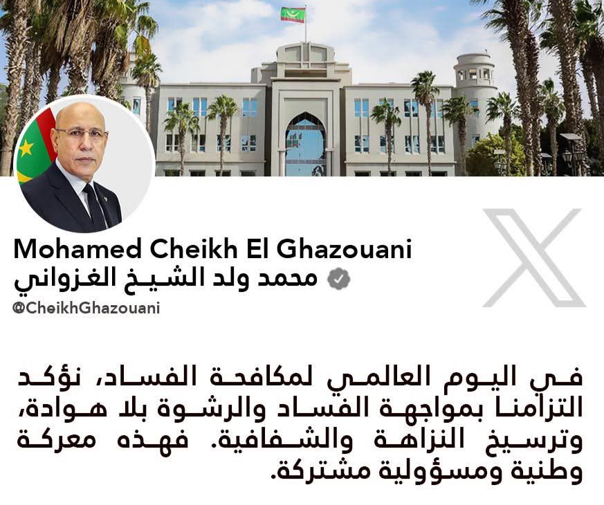 بمناسبة اليوم العالمي لمكافحة الفساد، أكد فخامة رئيس الجمهورية السيد محمد ولد الشيخ الغزواني، في تغريدة نشرها اليوم على حسابه بمنصة X، التزام الدولة بمواجهة الفساد والرشوة بلا هوادة، والعمل على ترسيخ قيم النزاهة والشفافية.