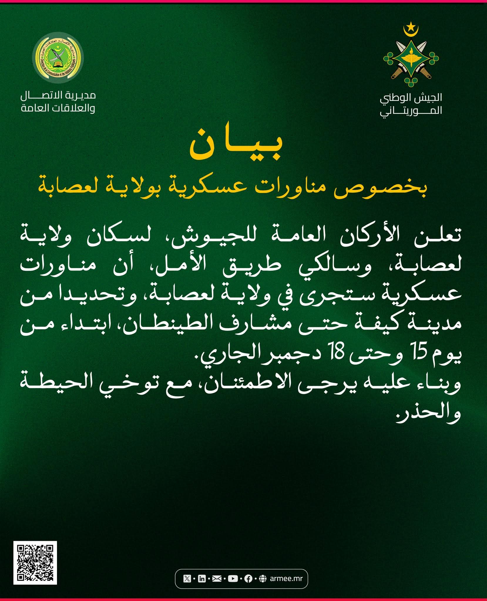 ودعت الأركان سكان المنطقة، وخاصة مستعملي طريق الأمل، إلى توخي الحيطة والحذر، مؤكدة أن هذه المناورات تدخل في إطار الجهود التدريبية الدورية، ولا تستدعي القلق، ومطمئنة الجميع بأن الإجراءات اللازمة قد اتُخذت لضمان السلامة.