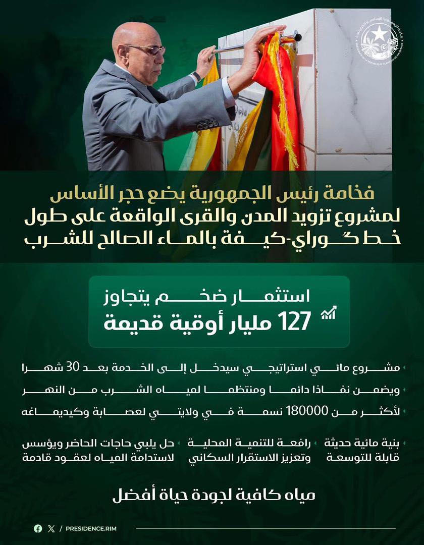 اليوم يضع فخامة رئيس الجمهورية السيد محمد ولد الشيخ الغزواني حجر الأساس لتزويد كيفه بالماء الشروب ..