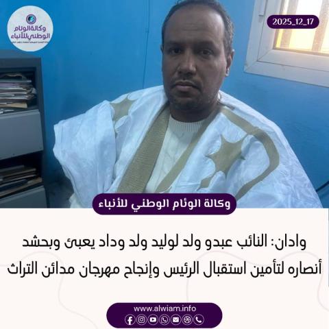 الوئام الوطني : وادان – في مشهدٍ يعكس عمق الانتماء الوطني وصلابة الرصيد الشعبي، برز النائب عبدو ولد لوليد ولد وداد، نائب مقاطعة وادان، بوصفه مهندس التعبئة الميدانية وقائد الحشد المنظم، وهو يشرف بحنكةٍ واقتدار على تأمين استقبالٍ حاشدٍ لفخامة رئيس الجمهورية السيد محمد ولد الشيخ الغزواني، وإنجاح مهرجان مدائن التراث الذي يشرف الرئيس على افتتاحه.