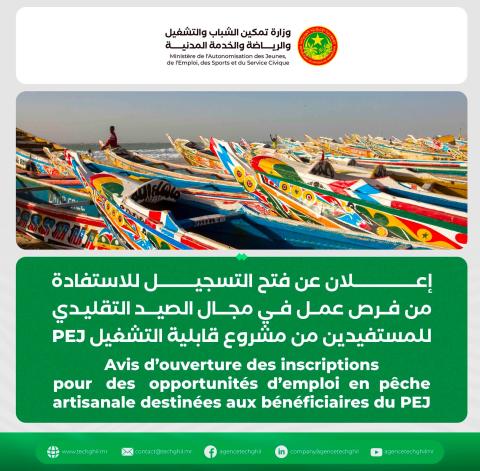 أعلنت وزارة تمكين الشباب والتشغيل والرياضة والخدمة المدنية عن فتح باب التسجيل للاستفادة من 1000 فرصة عمل في مجال الصيد التقليدي للأخطبوط، مخصصة للشباب الموريتانيين الذين سبق لهم الاستفادة من التكوين على مهارات الحياة ضمن مشروع قابلية التشغيل (PEJ)، ولم يتم توجيههم إلى التكوين المهني أو الأنشطة المدرة للدخل.