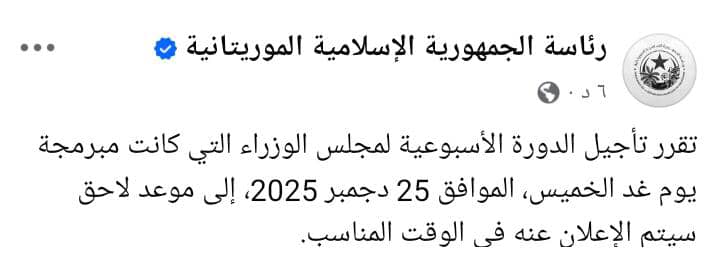 تقرر تأجيل الاجتماع الأسبوعي لمجلس الوزراء، الذي كان مقرراً عقده يوم غدٍ الخميس 25 ديسمبر 2025، إلى موعد لاحق، وفق ما أعلنت رئاسة الجمهورية.