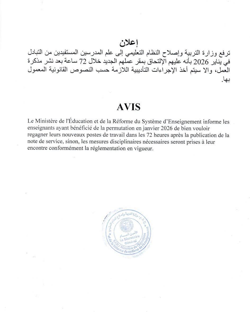 أعلنت وزارة التربية وإصلاح النظام التعليمي، في بيان رسمي صادر عنها، إلزام جميع المدرسين المستفيدين من حركة التبادل التي جرت خلال شهر يناير 2026، بالالتحاق بمقار عملهم الجديدة في أجل أقصاه 72 ساعة، ابتداءً من تاريخ نشر مذكرة العمل الخاصة بذلك.