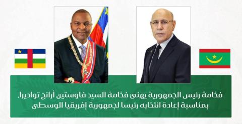 وجّه فخامة رئيس الجمهورية، السيد محمد ولد الشيخ الغزواني، برقية تهنئة إلى نظيره رئيس جمهورية إفريقيا الوسطى، السيد فوستان-أركانج تواديرا، بمناسبة إعادة انتخابه رئيساً للبلاد.