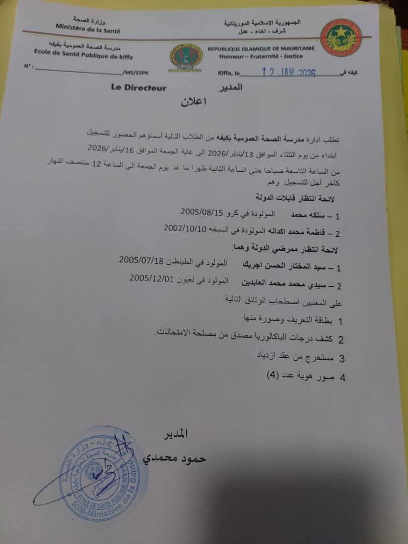 أعلنت إدارة مدرسة الصحة العمومية بمدينة كيفه عن استدعاء عدد من المترشحين، قصد استكمال إجراءات التسجيل، وذلك ابتداءً من يوم الثلاثاء 13 يناير 2026 وحتى يوم الجمعة 16 يناير 2026، خلال أوقات الدوام الرسمي من الساعة التاسعة صباحًا إلى الثانية عشرة ظهرًا، باستثناء يوم الجمعة.