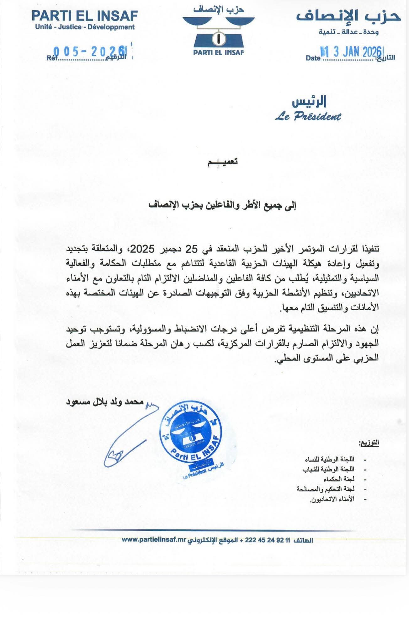 تنفيذًا لقرارات المؤتمر الأخير للحزب المنعقد في 25 دجمبر 2025، والمتعلقة بتجديد وتفعيل وإعادة هيكلة الهيئات الحزبية القاعدية لتتناغم مع متطلبات الحكامة والفعالية السياسية والتمثيلية، يُطلب من كافة الفاعلين والمناضلين الالتزام التام بالتعاون مع الأمناء الاتحاديين، وتنظيم الأنشطة الحزبية وفق التوجيهات الصادرة عن الهيئات المختصة بهذه الأمانات والتنسيق التام معها.