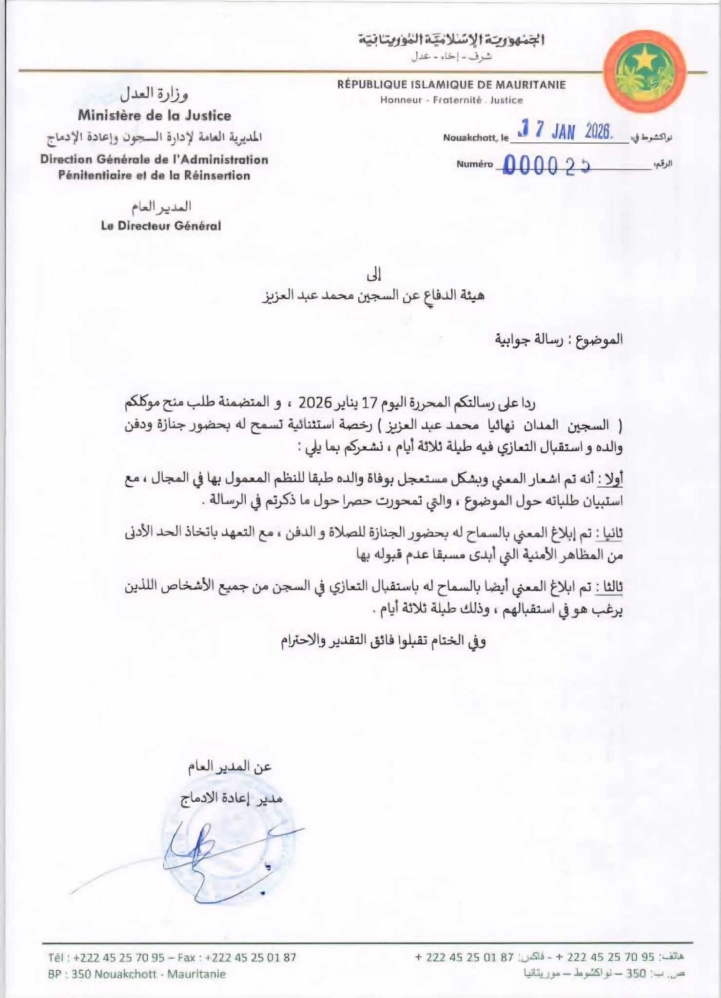 أعلنت وزارة العدل، عبر المديرية العامة لإدارة السجون وإعادة الإدماج، السماح للسجين محمد عبد العزيز بحضور جنازة ودفن والده، وذلك استجابةً لطلب تقدمت به هيئة الدفاع عنه.