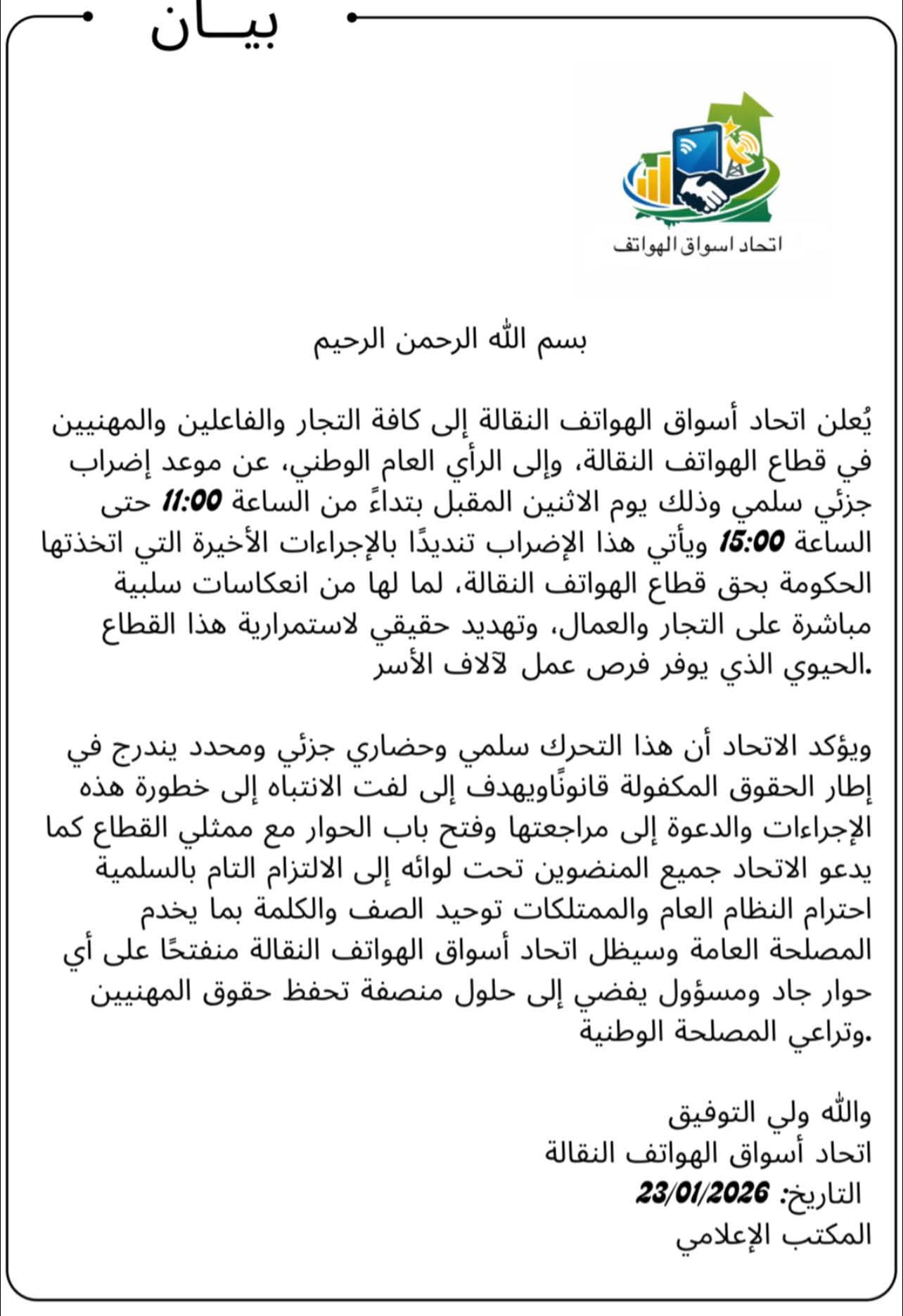 أعلن اتحاد أسواق الهواتف النقالة عن تنظيم إضراب جزئي سلمي، يوم الاثنين المقبل، من الساعة 11:00 إلى 15:00، احتجاجًا على الإجراءات الحكومية الأخيرة التي قال إنها أثرت سلبًا على نشاط قطاع الهواتف النقالة.