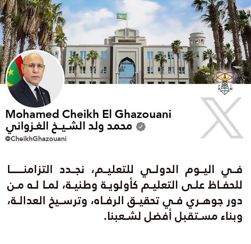 أكد فخامةُ رئيس الجمهورية السيد محمد ولد الشيخ الغزواني، في تغريدة عبر حسابه على منصة X، أن التعليم يظل أولوية وطنية، مشددًا على دوره الجوهري في تحقيق الرفاه، وترسيخ العدالة، وبناء مستقبل أفضل للشعب، وذلك بمناسبة اليوم الدولي للتعليم.