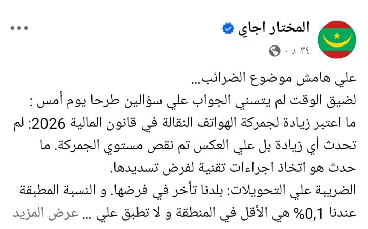 قال الوزير الأول المختار ولد اجاي، عبر صفحته على فيسبوك، أنه على هامش النقاش المتعلق بالضرائب، وبسبب ضيق الوقت، لم يتسنَّ له الرد يوم أمس على سؤالين أُثيرا بخصوص قانون المالية لسنة 2026.