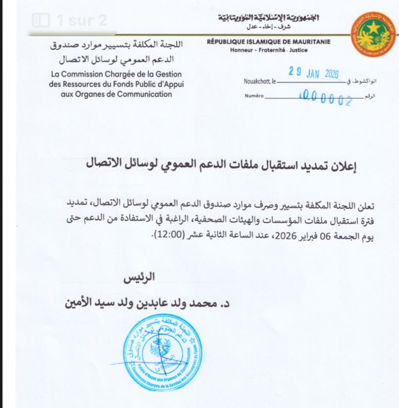 أعلنت اللجنة المكلفة بتسيير وصرف موارد صندوق الدعم العمومي لوسائل الاتصال عن تمديد فترة استقبال ملفات المؤسسات والهيئات الصحفية الراغبة في الاستفادة من الدعم العمومي، وذلك إلى غاية يوم الجمعة 06 فبراير 2026 عند الساعة الثانية عشرة زوالاً (12:00).
