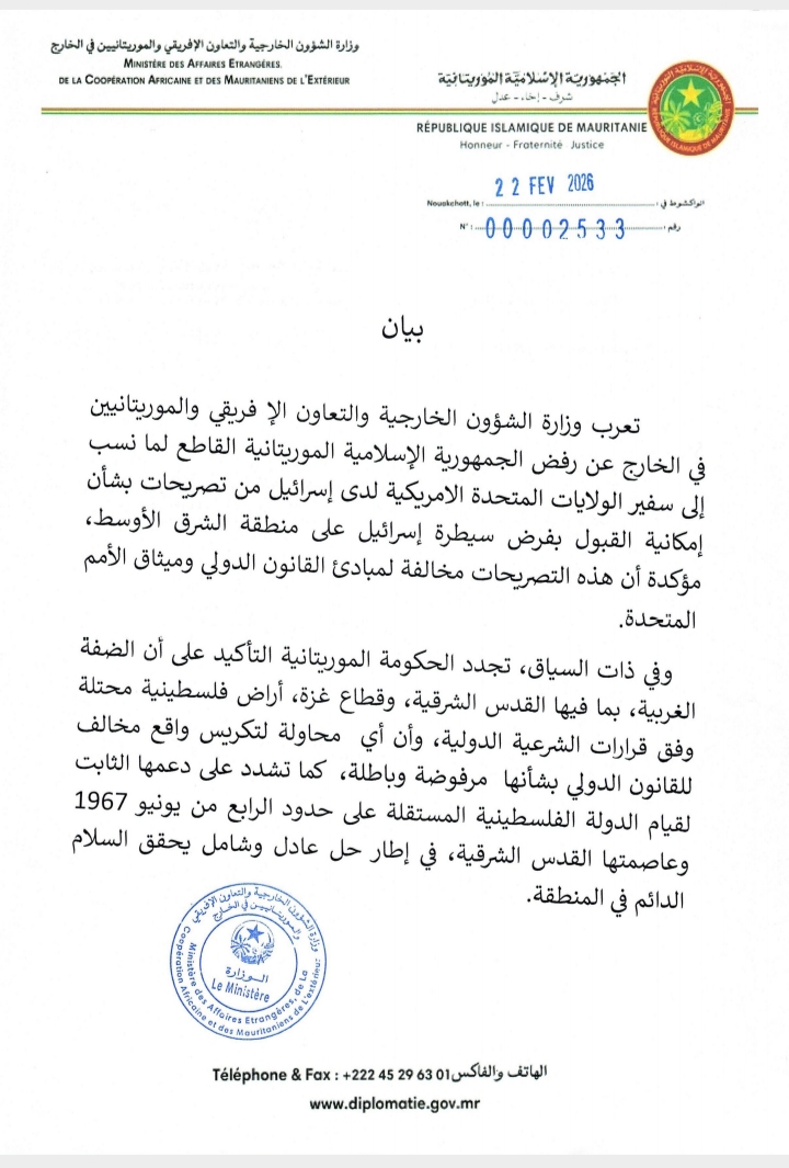 أعربت وزارة الشؤون الخارجية والتعاون الإفريقي والموريتانيين في الخارج في الجمهورية الإسلامية الموريتانية عن رفضها القاطع لما نُسب إلى سفير الولايات المتحدة الأمريكية لدى إسرائيل من تصريحات بشأن إمكانية القبول بفرض سيطرة إسرائيل على منطقة الشرق الأوسط، مؤكدة أن مثل هذه التصريحات تمثل مخالفة صريحة لمبادئ القانون الدولي وميثاق الأمم المتحدة.