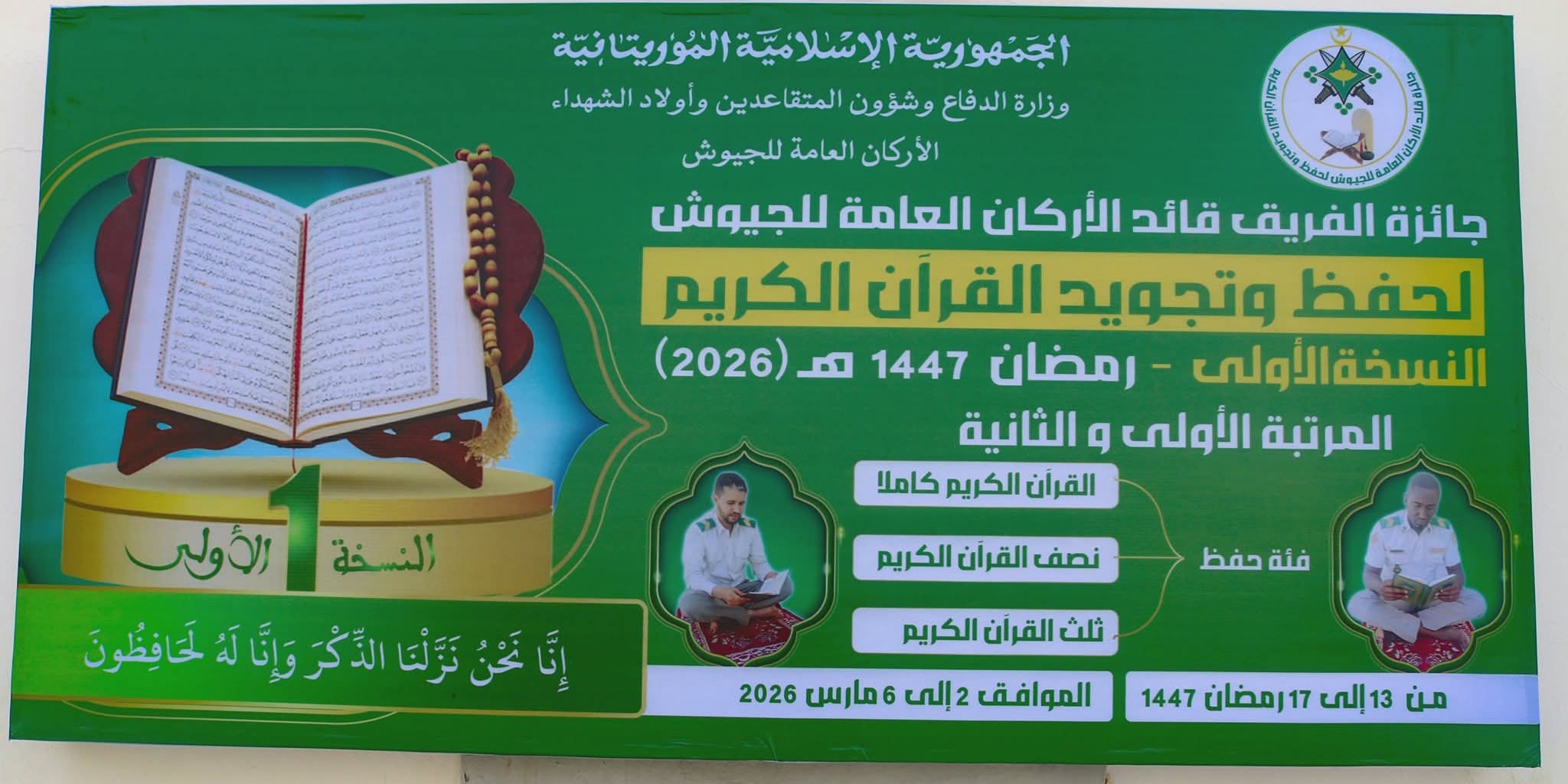 انطلقت اليوم الاثنين 2 مارس 2026، بمسجد كتيبة القيادة والخدمات في الأركان العامة للجيوش، فعاليات النسخة الأولى من مسابقة «جائزة قائد الأركان العامة للجيوش لحفظ وتجويد القرآن الكريم»، بمشاركة عسكريين من مختلف الرتب.