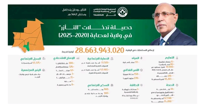 وبلغ إجمالي الاستثمارات المنفذة في الولاية 28,663,943,020 أوقية قديمة، شملت مجالات السجل الاجتماعي، الحماية الاجتماعية، الإدماج الاقتصادي، السكن، المياه، الأمن الغذائي، الطاقة، التعليم، والصحة.