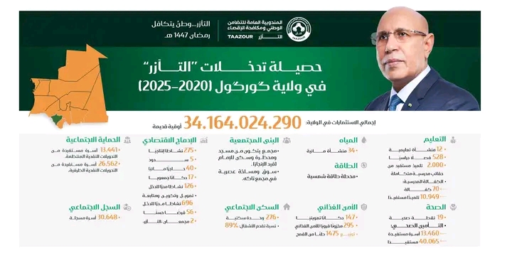 كشفت المندوبية العامة للتضامن الوطني ومكافحة الإقصاء "تآزر" عن نتائج تدخلاتها في ولاية گوركول خلال الفترة 2020-2025، والتي بلغت قيمتها الإجمالية 34,164,024,290 أوقية قديمة، مستهدفة عدة قطاعات حيوية لتحسين ظروف المعيشة وتعزيز التنمية المحلية.