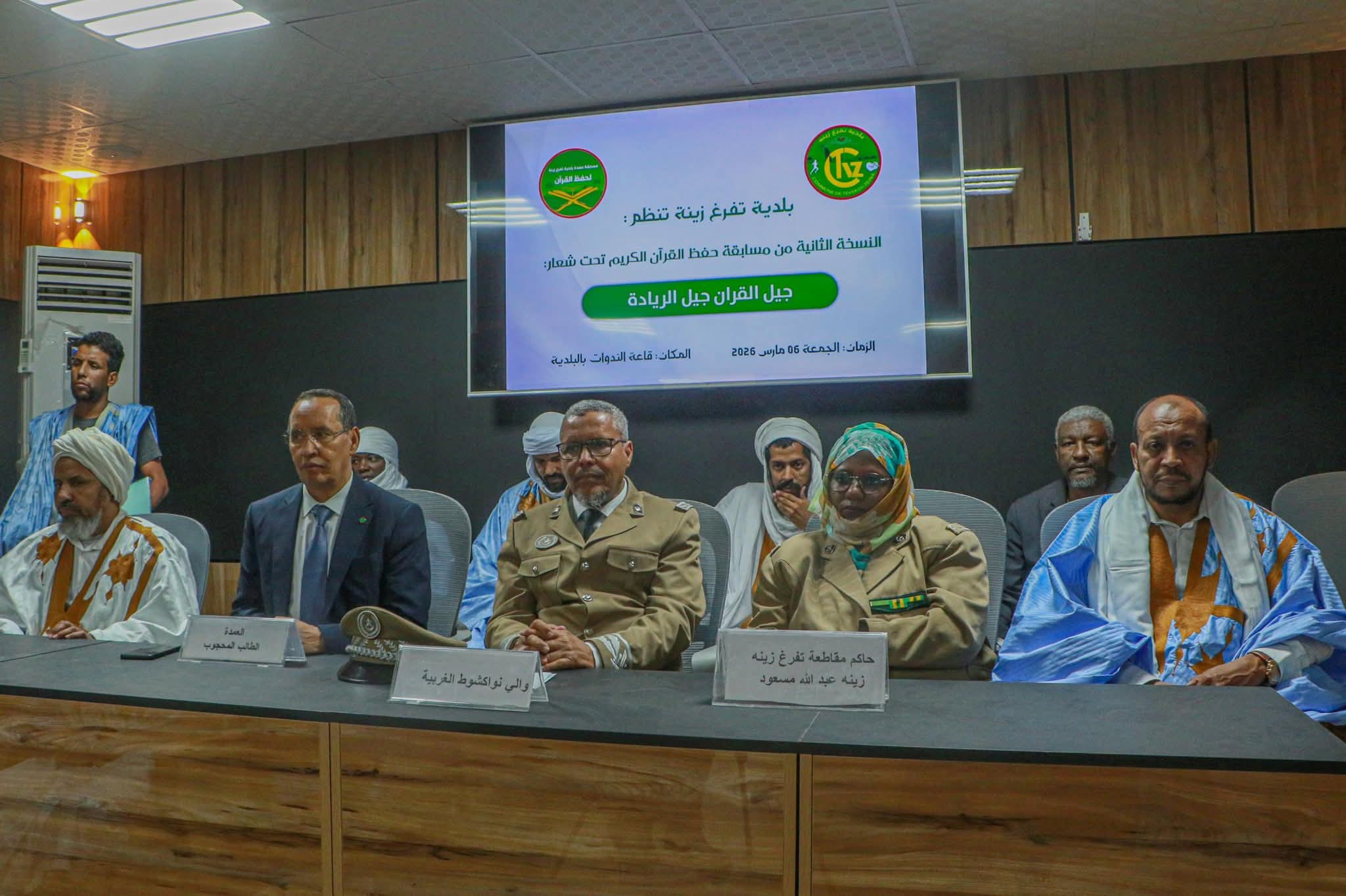 انطلقت صباح اليوم بمباني بلدية تفرغ زينة النسخة الثانية من مسابقة حفظ وتجويد القرآن الكريم تحت شعار "جيل القرآن جيل الريادة"، وذلك في إطار الأنشطة الرمضانية وبحضور الوالي المساعد لولاية نواكشوط الغربية، وحاكم مقاطعة تفرغ زينة، وعمدة البلدية.