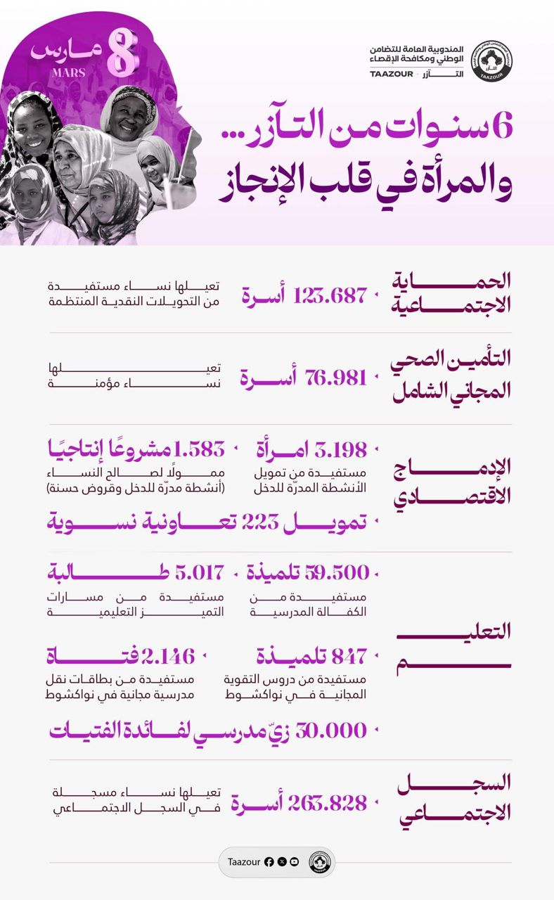 وتجسد هذه النتائج العناية الخاصة التي يوليها فخامة رئيس الجمهورية، السيد محمد ولد الشيخ الغزواني، لتمكين المرأة وتعزيز حضورها في قلب السياسات الاجتماعية، إيمانًا بدورها المحوري في بناء مجتمع أكثر تضامنًا وعدالة.
