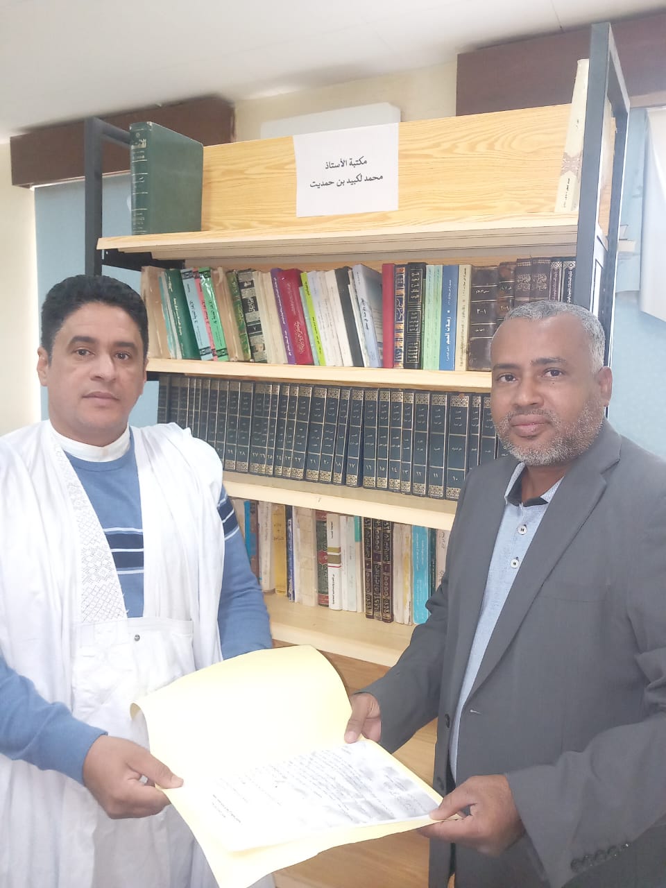وخلال الحفل، تم التوقيع على محضر التسليم، حيث قام بتسليم المكتبة نيابة عن الأستاذ محمد لكبيد، نجله المهندس أحمدو لكبيد.