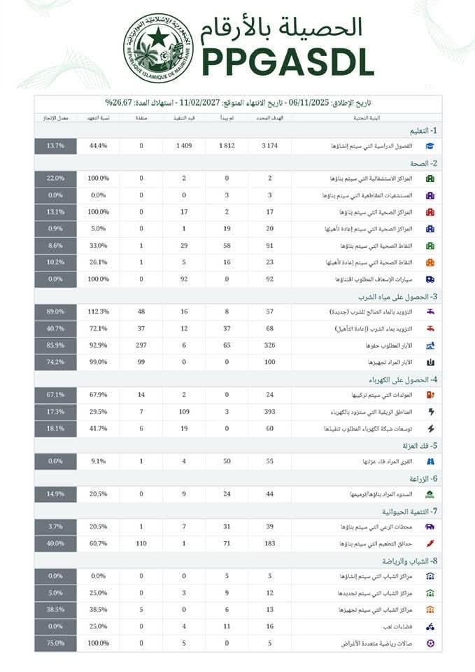 بعد أربعة أشهر من إطلاقه من مدينة النعمة من طرف صاحب الفخامة رئيس الجمهورية محمد ولد الشيخ الغزواني، تتقدم الأشغال بشكل في أكبر برنامج للنفاذ للخدمات الأساسية في تاريخ البلد ينفذ في ولاياتنا الداخلية بشكل متزامن. يشمل هذه البرنامج مكونات : التعليم (3174 حجرة درس جديدة)، الصحة (بناء أو إعادة تأهيل 156 منشأة صحية) ، الماء (551 منشأة مائية) الكهرباء (477 قرية و مدينة)، الزراعة (44 سدا)، التنمية الحيوانية(222 منشأة)، قمقم العزلة (55 منطقة) و الرياضة )51 منشأة).