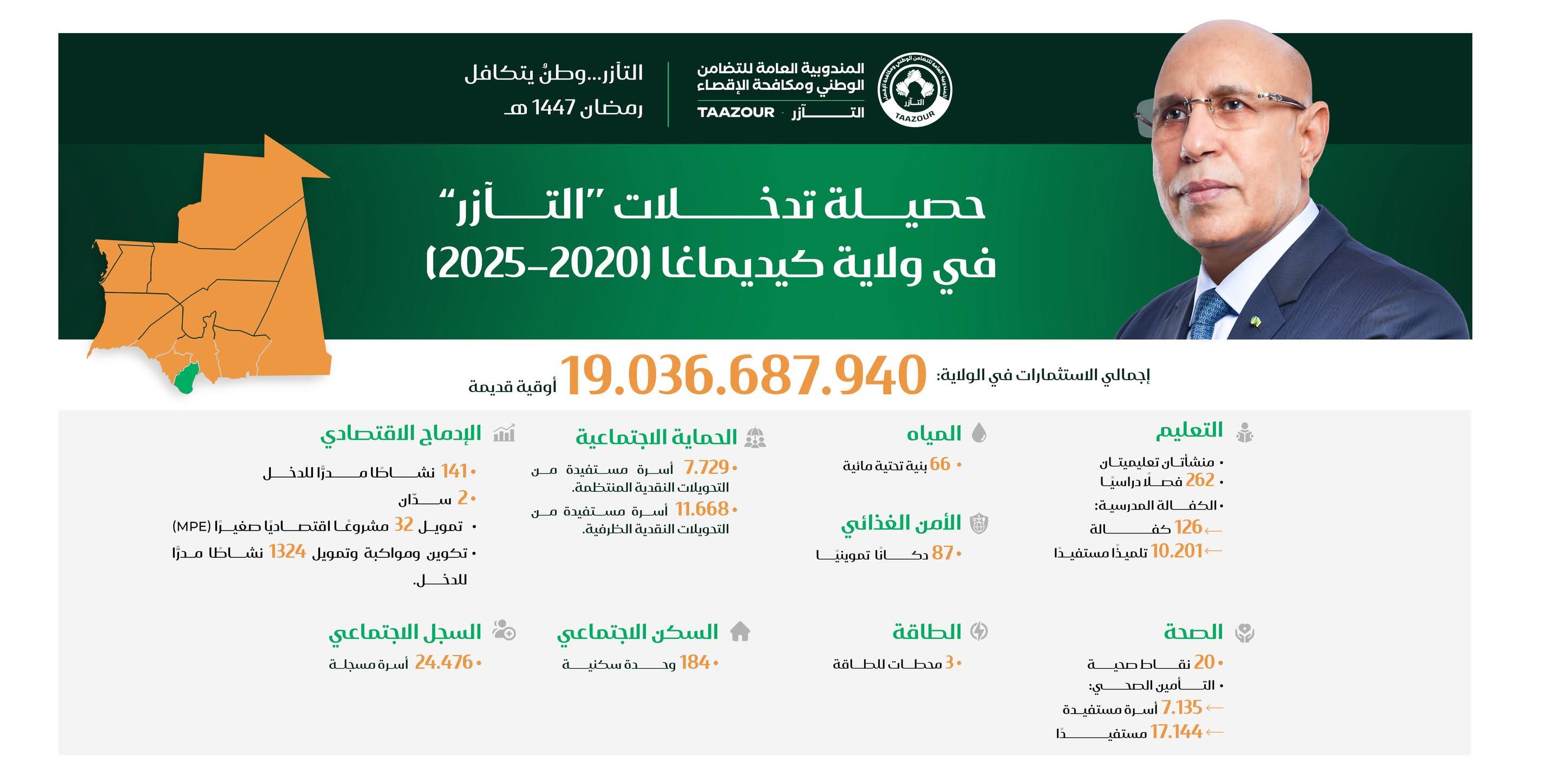 أعلنت المندوبية العامة للتضامن الوطني ومكافحة الإقصاء – التآزر حصيلة تدخلاتها في ولاية كيديماغا خلال السنوات الست الماضية، حيث بلغت الاستثمارات المنفذة في الولاية أكثر من 19 مليار أوقية قديمة، ضمن برامج تستهدف دعم الفئات الهشة وتعزيز الولوج إلى الخدمات الأساسية.