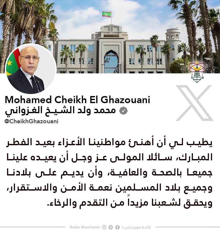 فخامةُ رئيس الجمهورية السيد محمد ولد الشيخ الغزواني مُغرداً عبر حسابه منصة X: