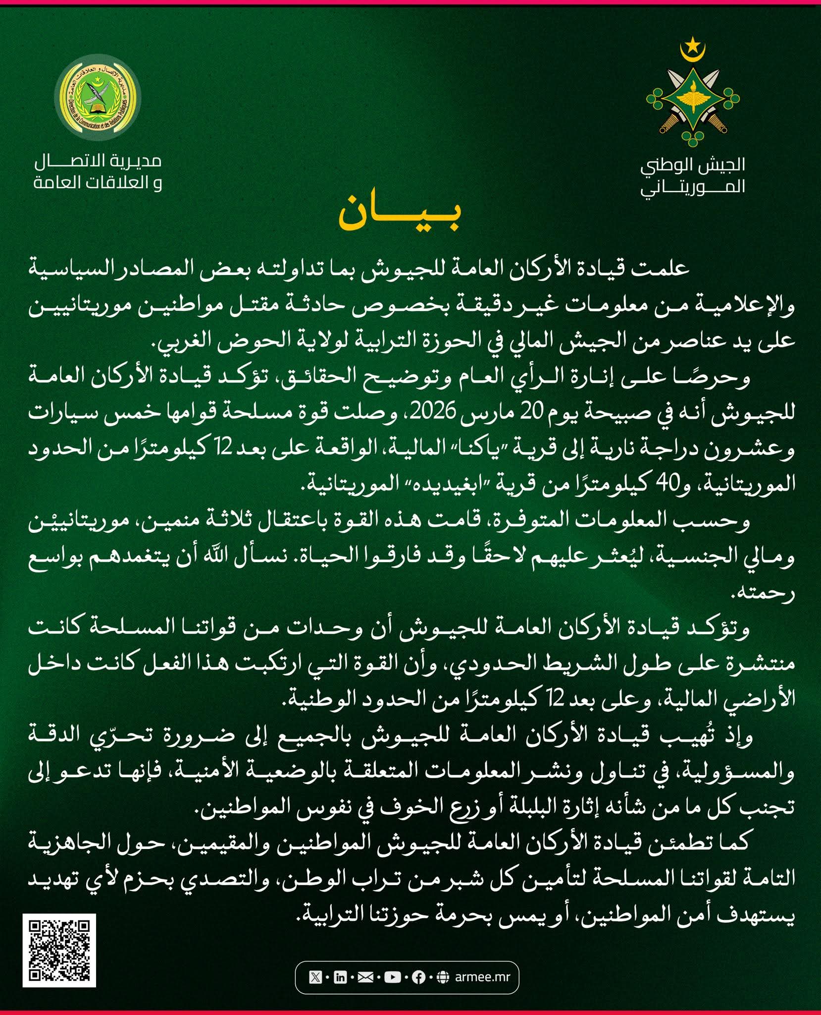 أصدر الجيش الوطني الموريتاني بيانًا توضيحيًا بشأن حادثة مقتل مواطنين موريتانيين قرب الحدود مع جمهورية مالي، وذلك ردًا على ما تم تداوله من معلومات وصفتها بغير الدقيقة.
