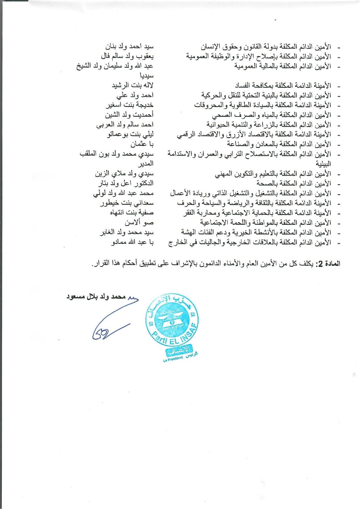 أصدر رئيس حزب الإنصاف، محمد ولد بلال مسعود، قرارًا يقضي بتوزيع الأمانات الدائمة داخل الحزب على الأمناء الدائمين، وذلك في إطار إعادة تنظيم الهياكل القيادية وتعزيز أداء العمل الحزبي.