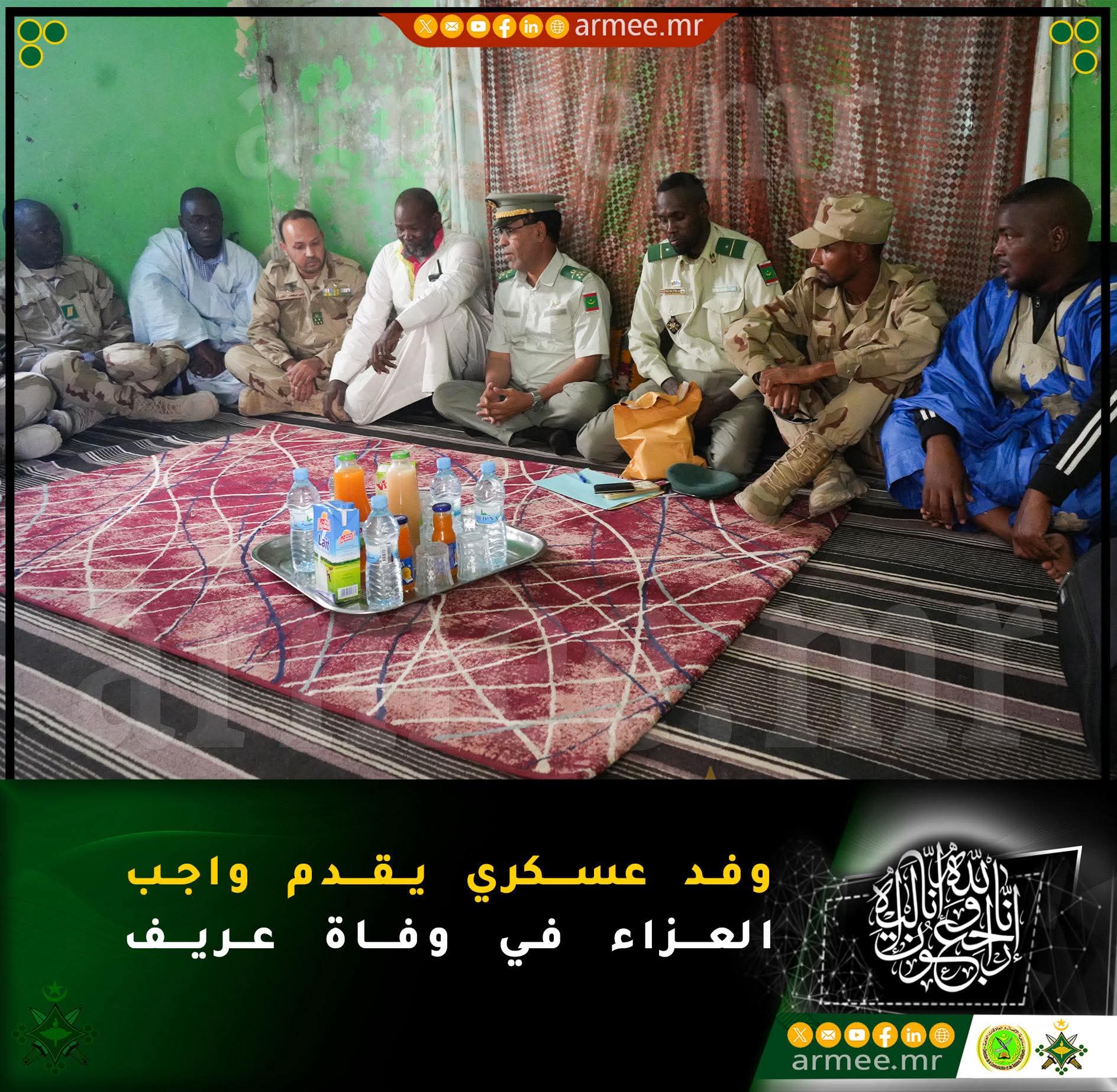 أدى وفد عسكري، برئاسة العقيد محمد الأمين شيخنا سيدي عبدالله، مدير الشؤون الاجتماعية بالأركان العامة للجيوش، زيارة تعزية ومواساة لأسرة العريف الحسن الشيخ، التابع للمؤسسة المركزية لإصلاح العتاد، وذلك عقب وفاته يوم الجمعة 27 مارس 2026 بالمستشفى العسكري في نواكشوط، بعد معاناة مع المرض.