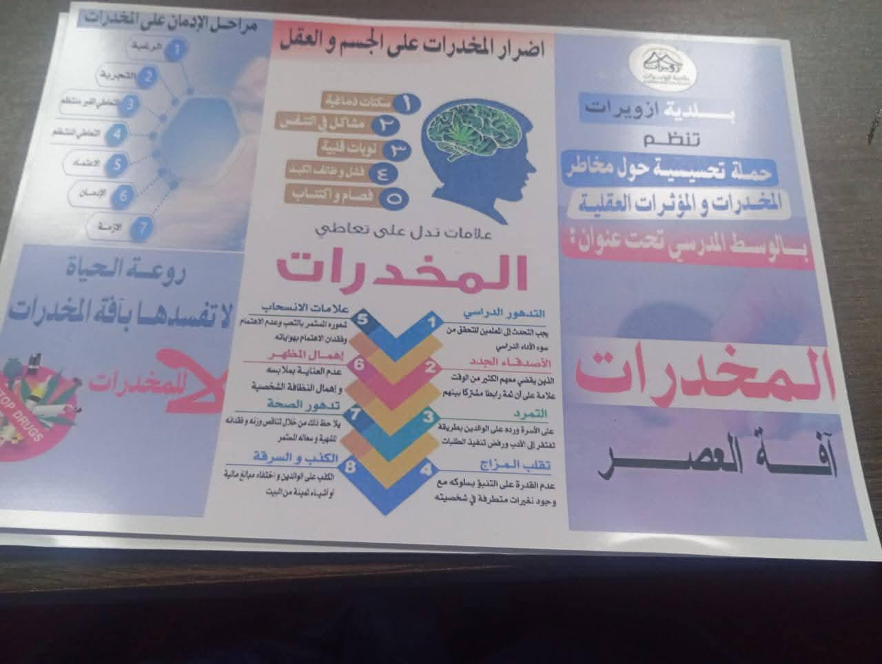 نظمت بلدية أزويرات مساء امس ورشة تحسيسية حول مخاطر المخدرات والمؤثرات العقلية في الوسط المدرسي تحت شعار "المخدرات ... آفة العصر" وتأتي هذه المبادرة ضمن جهود السلطات المحلية لرفع الوعي بين التلاميذ وتحصينهم ضد ظاهرة الإدمان وآثارها الاجتماعية والصحية