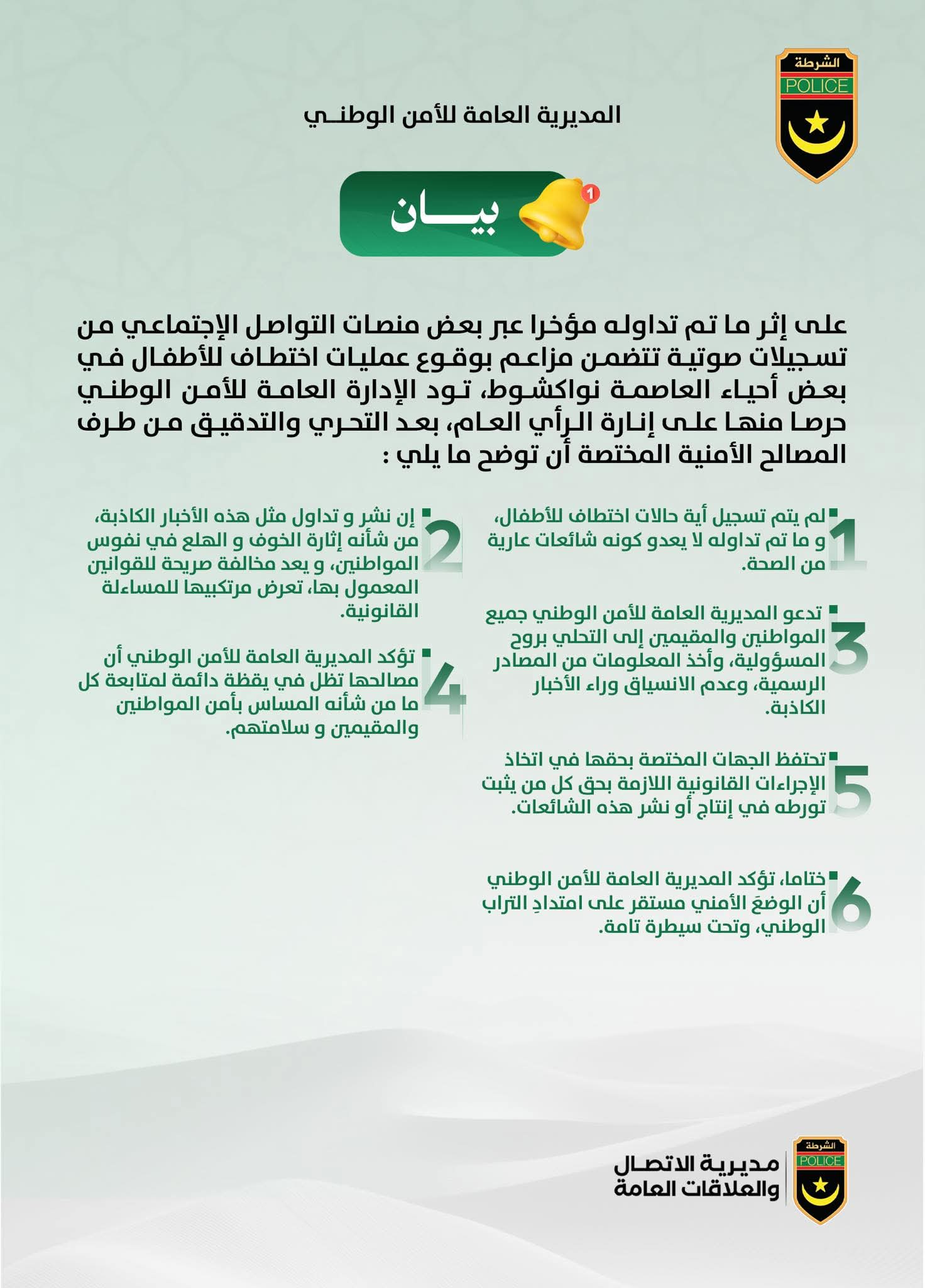 نفت المديرية العامة للأمن الوطني صحة ما تم تداوله مؤخراً عبر بعض منصات التواصل الاجتماعي من تسجيلات صوتية تزعم وقوع عمليات اختطاف للأطفال في بعض أحياء نواكشوط.