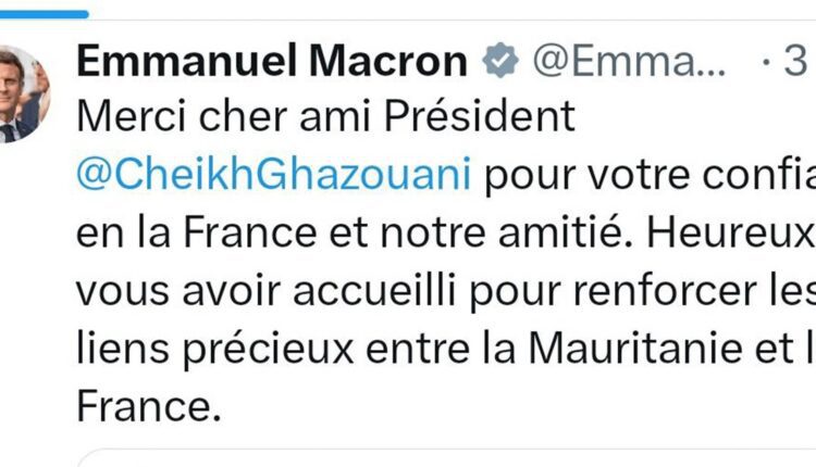أعرب الرئيس الفرنسي إيمانويل ماكرون، في تغريدة على منصة “إكس”، عن شكره وتقديره للرئيس محمد ولد الشيخ الغزواني، مثمّناً الثقة التي يوليها لفرنسا، ومشيداً بمتانة علاقات الصداقة والتعاون بين موريتانيا وفرنسا.