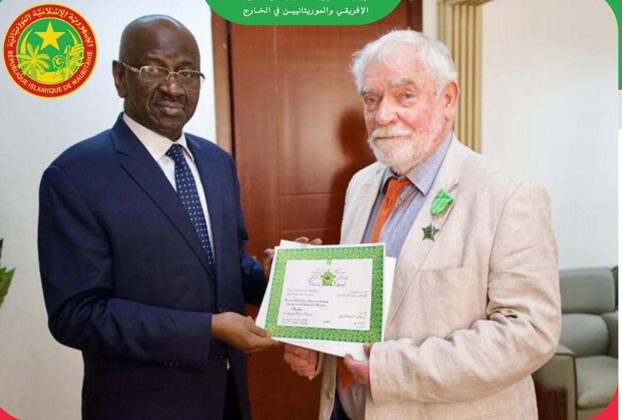 وشح وزير الشؤون الخارجية والتعاون الإفريقي والموريتانيين في الخارج، السيد محمد سالم ولد مرزوك، باسم رئيس الجمهورية السيد محمد ولد الشيخ الغزواني، اليوم الخميس بمقر الوزارة في نواكشوط، الدكتور روبير فيرنيه، الأستاذ المبرّز في التاريخ والباحث في علم الآثار حول موريتانيا، بوسام فارس من نظام الاستحقاق الوطني.