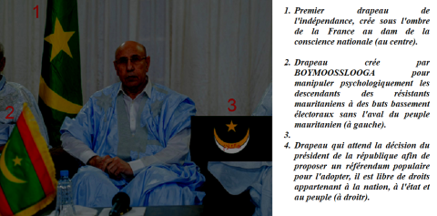 2.   Drapeau crée par BOYMOOSSLOOGA pour manipuler psychologiquement les descendants des résistants mauritaniens à des buts bassement électoraux sans l'aval du peuple mauritanien.