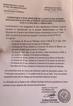 Si hier deux cas supplémentaire ont été annoncés lors du journal de la chaine national 1. Ce matin le ministre lui a annoncé 7 nouveaux cas. Les personnes infectées sont : un homme de Le ministre de la santé et des affaires sociale