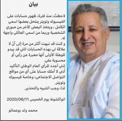 Mohamed Ould Bouamatou indique que des personnes malveillantes et malintentionnées utilisent une quinzaine de faux comptes portant son nom différemment orthographié sur le réseau social Facebook, pour poster des commentaires ou des publications, dans le but d’induire en erreur les hommes et les femmes, qui en toute bonne foi, entrent en contact ou interagissent avec eux.