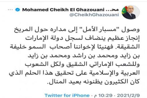 Son Excellence le Président de la République, M. Mohamed Ould Cheikh El Ghazouani a salué hier soir l'arrivée de la "sonde de l'espoir" sur son orbite autour de Mars, qualifiant l'événement de "grande réussite".
