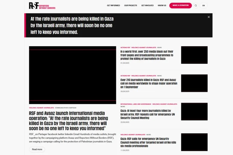وعتّمت "مراسلون بلا حدود" موقعها باللون الأسود، في حين خصصت صحيفة الغارديان البريطانية افتتاحيتها للحديث عن مقتلة الصحفيين في غزة، لافتة إلى أن جيلا كاملا من الصحفيين يتم القضاء عليه، وشددت على أن "إسرائيل تريد منع العالم من رؤية ما تفعله".