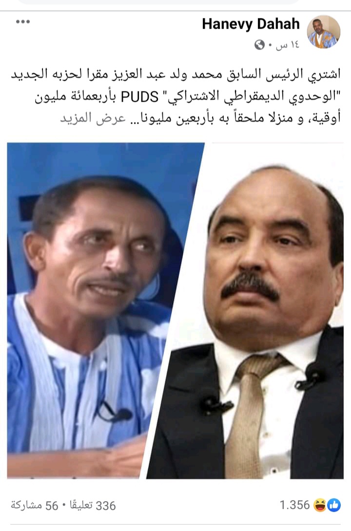 ((اشتري الرئيس السابق محمد ولد عبد العزيز مقرا لحزبه الجديد "الوحدوي الديمقراطي الاشتراكي" PUDS بأربعمائة مليون أوقية، و منزلا ملحقاً به بأربعين مليونا ليجعل منه موقفاً للسيارات.