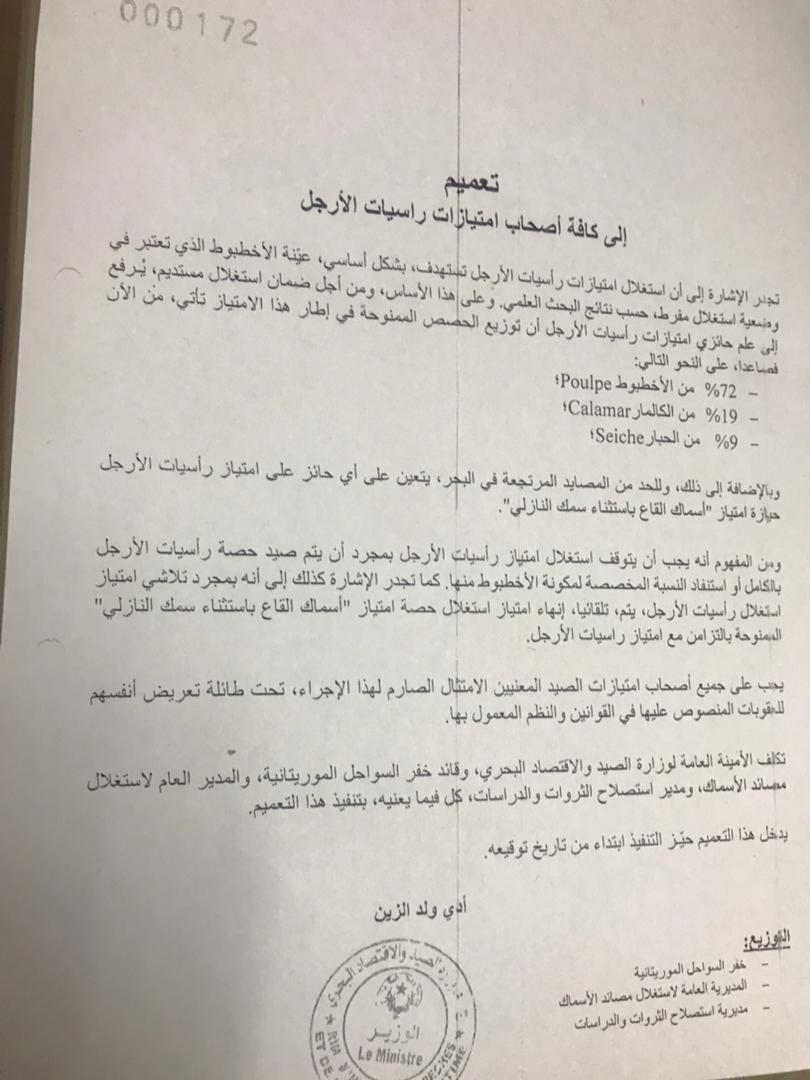 حددت وزراة الصيد والاقتصاد والبحري في تعميم صادر عنها النسبة المسموح بها من صيد رأسيات الأرجل